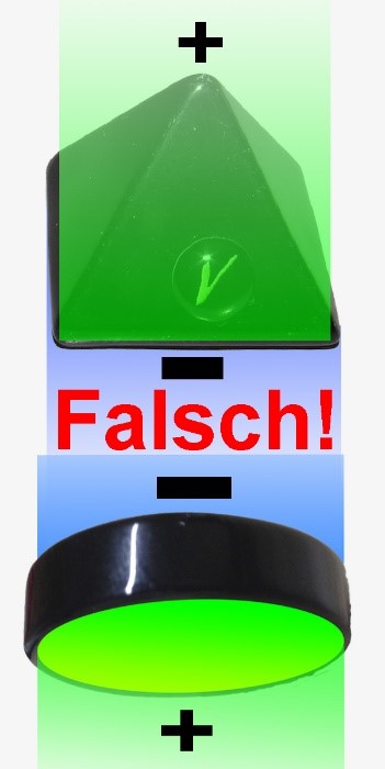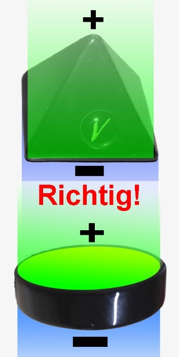 Werden zwei Vortex HiFi A.I.O. – Produkte (z.B. eine Ronde und eine Pyramide) eingesetzt, so müssen immer entgegengesetzte Felder aufeinander wirken. Bei der Pyramide 30 / 40 müssen die Standfläche (hier Minus-Symbol) und eine nicht Logo – Fläche der Ronde (hier Plus-Symbol) aufeinander zeigen.