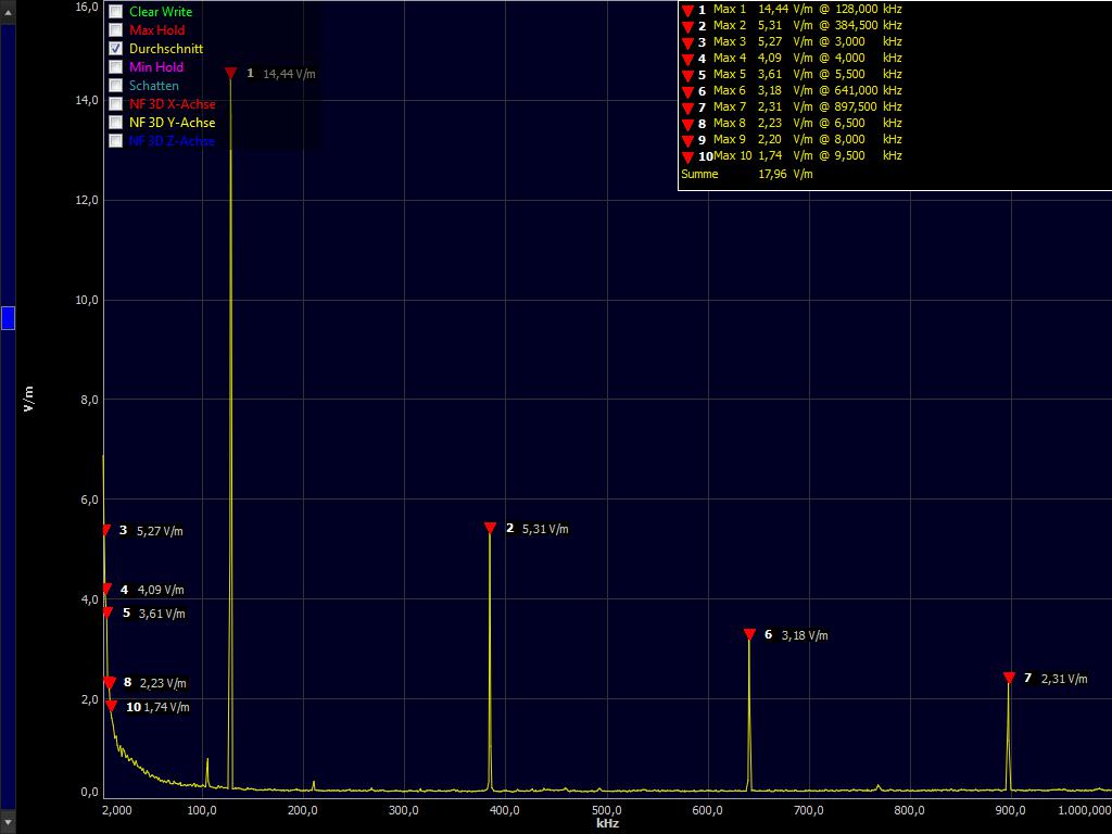 Stehende Wellen treten auf, wenn der Wellenwiderstand der einzelnen Komponenten nicht angepasst ist. Wenn also die Buchse nicht zum Stecker passt, der Stecker nicht zum Kabel, usw. Da auf der Masse ein Störspektrum bis über 20MHz zu messen ist, ist der Wellenwiderstand sehr wichtig. Am Cinchkabel gemessenes E-Feld im Dirty Power Bereich ab 2.000 Hz.