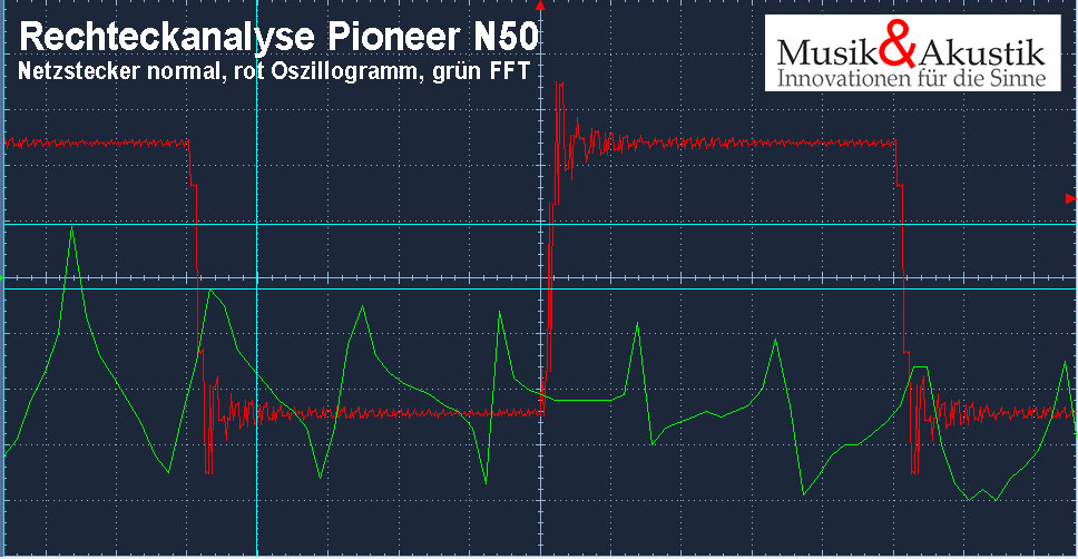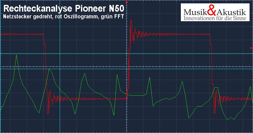 Aber was verändert sich im Audio-Signal? Nichts! Die beiden Grafiken zeigen ein Oszyllogramm und eine Spektrumanalyse eines PIONEER N50 einmal mit korrekter Netzstecker-Position und einmal mit der falschen. Im Signal ist keine Veränderung zu sehen, obwohl sich die Spannung und der Klang deutlich geändert haben!